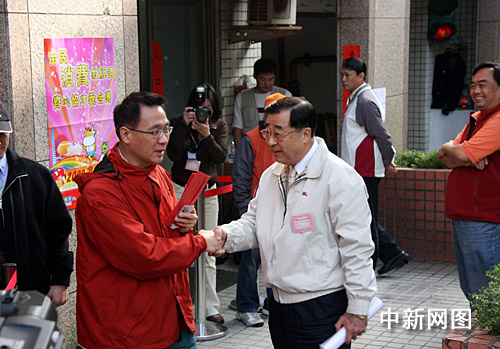 1月18日上午,備受全臺和外界關注的消費券開始在臺灣各發放所發放。圖為臺灣內政部門主管消費券發放的負責人廖了以(右一)今天上午到消費券發放所督導。鼓勵臺灣民眾善用消費券,積極促進內需,擴大消費。陳立宇 攝