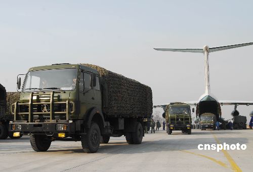 2月1日下午,中國空軍運(yùn)輸機(jī)再次抵達(dá)山西長治某軍用機(jī)場,緊急空運(yùn)救災(zāi)物資到南方冰雪災(zāi)區(qū)。從1月31日起,中國空軍運(yùn)輸機(jī)多次飛抵該機(jī)場,駐當(dāng)?shù)啬巢肯群蟪鰟庸俦?00多人次,動用車輛裝備130多臺次,日夜奮戰(zhàn),已經(jīng)將100多噸棉被棉衣等救援物資分6個(gè)架次空運(yùn)南方,以解南方災(zāi)區(qū)人民御寒之急。中新社發(fā) 姚林 攝