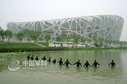 隨著北京奧運會的臨近,擔任援奧水下安檢的海軍南海艦隊某潛水分隊緊貼任務特點,苦練水下探摸本領,為圓滿完成北京奧運重要場館水下探摸任務打下堅實基礎。圖為7月25日,蛙人官兵們正在對“鳥巢”周圍水系采取一字形地毯式全面搜索排查的鏡頭。 蒲豐 攝
