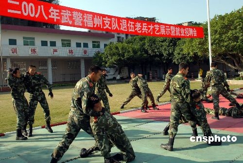 11月20日,武警福建福州支隊退伍兵專場招聘會在福州舉行。來自福州市的近20家用人單位來到招聘會現(xiàn)場,推出了微機操作、保安、公安戰(zhàn)線警務(wù)人員、物業(yè)、駕駛員、廚師等300多個工作崗位,供350多名即將退伍的老兵選擇。招聘會現(xiàn)場,退伍老兵通過軍事技能、電腦操作等才藝展示,面對面與用人單位溝通交流。中新社發(fā) 李濤 攝