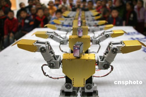 11月15日,人形機(jī)器人正在表演《千手觀音》節(jié)目。當(dāng)天,人形機(jī)器人表演科技觀摩活動(dòng)在江蘇連云港婦女兒童活動(dòng)中心舉行,15個(gè)人形機(jī)器人表演了《千手觀音》、小品《賣拐》、體操等節(jié)目。由中科大花費(fèi)兩年時(shí)間研制成功的人形機(jī)器人,身體具有17個(gè)自由度的調(diào)節(jié)功能,可做俯臥站立、跳舞、擁抱、做操等二十多個(gè)動(dòng)作,代表了中國(guó)表演類機(jī)器人的最高水平。中新社發(fā) 穆道勇 攝