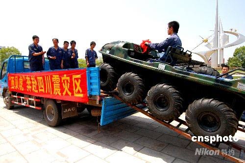5月18日,由浙江義烏西貝文良特種車輛有限公司,捐贈給四川消防總隊的一輛“西貝虎”新型水陸兩棲全地型功能車,從義烏出發,晝夜兼程趕往四川德陽,投入抗震救災。中新社發 張建成 攝