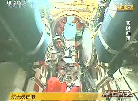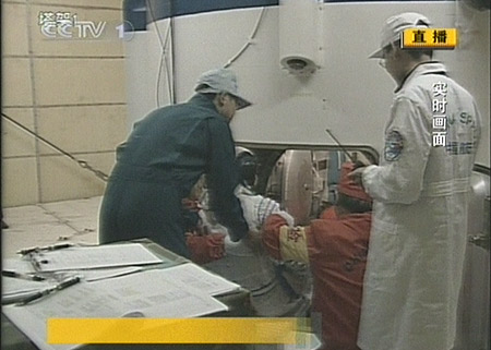 25日18時(shí)25分許,神舟七號(hào)三名航天員陸續(xù)進(jìn)艙。第一名進(jìn)艙的是景海鵬,第二名進(jìn)艙的是劉伯明,最后,指令長(zhǎng)翟志剛也開(kāi)始進(jìn)入。