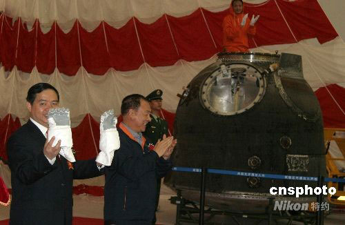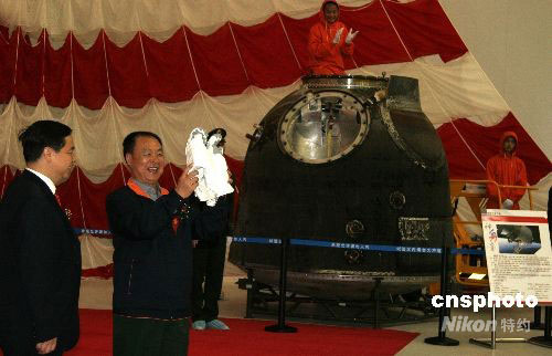 10月1日上午,神舟七號載人飛船返回艙在其誕生地——中國航天科技集團公司所屬中國空間技術(shù)研究院舉行開艙暨搭載物交接儀式,伴隨三位中國航天員太空飛行六十八小時二十七分鐘的一批特殊“乘客”一一精彩亮相,隨后各歸其主。圖為中國載人航天工程航天員系統(tǒng)總指揮兼總設(shè)計師、中國航天員科研訓練中心主任陳善廣展示將由該中心珍藏、首次成功使用過的“飛天”艙外航天服手套。中新社發(fā) 孫自法 攝