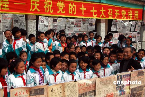 10月18日,山東省郯城縣港上鎮中心小學舉辦“光輝的歷程——慶祝黨的十七大勝利召開藏報展”,共展出退休教師丁思德珍藏的報道歷屆歷次“黨代會”的各類報紙177份。黨的光輝歷程激發了師生們的愛國熱情。中新社發 房德華 攝