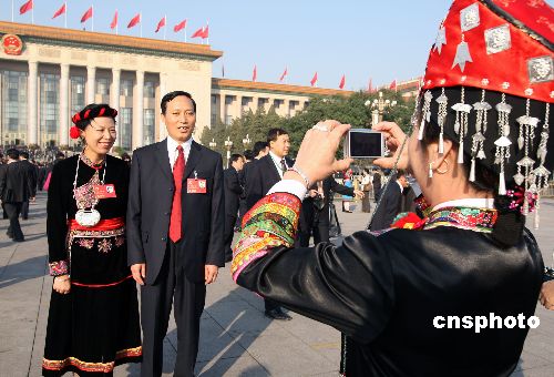 中國共產黨第十七次全國代表大會10月21日上午在北京人民大會堂閉幕。圖為福建代表團的畬族代表雷金花在大會堂外為代表們拍攝紀念照。中新社發(fā) 任晨鳴 攝