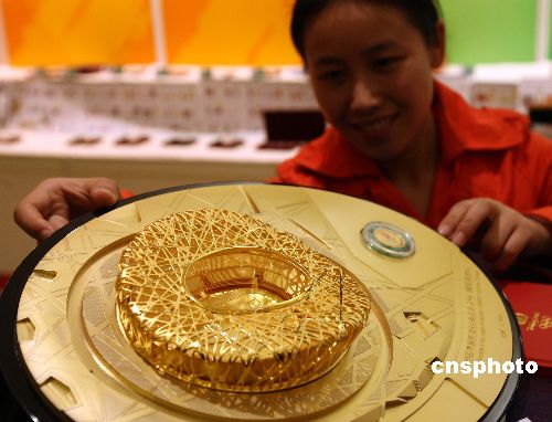 一月五日,北京奧組委推出七十余款?yuàn)W運(yùn)貴金屬特許商品新品,其中包括常規(guī)鍍金銀類產(chǎn)品、金銀類產(chǎn)品及珍藏系列金銀、金玉新工藝紀(jì)念章等。這些產(chǎn)品將奧運(yùn)元素與中國(guó)文化和諧融合一體,彰顯“綠色奧運(yùn)、科技奧運(yùn)、人文奧運(yùn)”的理念。中新社發(fā) 任海霞 攝