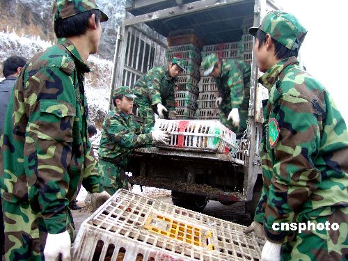 半個多月的凝凍天氣,使貴州清鎮(zhèn)麥格鄉(xiāng)小谷隴村村萬余只成熟肉雞難以運出。1月31日,該市人民武裝部的應急民兵緊急出動,幫助村民及時將肉雞運往收購地點。中新社發(fā) 申時進 攝