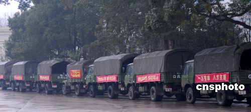 2月4日,雪凝天氣尚未結束,貴陽地區又飄起了毛毛細雨,在省政府廣場上,武警戰士在裝運重慶等省市支援貴州的救災物資和小型發電機,準備運往此次雪災中受災嚴重的黔東南、黔南、銅仁、畢節等地區。此次持續20多天的雪凝凌凍天氣,使貴州省70多個縣市受災嚴重,部分縣市停水斷電已近20天。中新社發 歐陽昌佩 攝