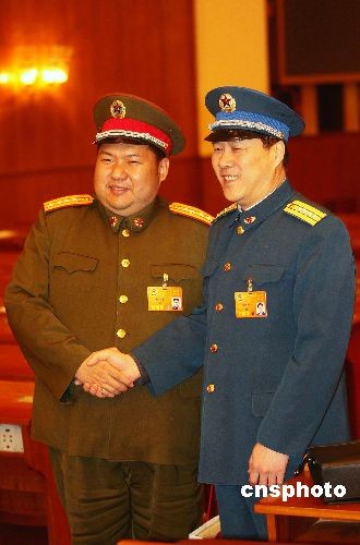 三月八日上午,全國政協(xié)十一屆一次會議第二次全體會議在北京人民大會堂舉行。毛澤東之孫、解放軍軍事科學院戰(zhàn)爭理論和戰(zhàn)略研究部研究員毛新宇出席,與朱德的孫子——空軍指揮學院副院長朱和平握手并合影。中新社發(fā) 盛佳鵬 攝