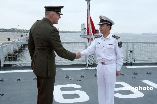 圖為美國海軍陸戰隊司令問候中國海軍“武漢”號導彈驅逐艦艦長羅曉勇,該軍艦是中國自行設計建造的新型現代化軍艦。中新社發 李唐 攝