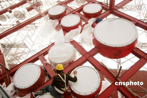 4月5日,北京奧林匹克中心區下沉花園,施工人員正在加緊往桔紅色框架上安裝大鼓,迎接2008北京奧運會。據悉,這些大鼓的直徑在1米至兩米左右, 屆時,數百個大鼓將組成一道富有中國特色的靚麗風景。中新社發 吳芒子 攝