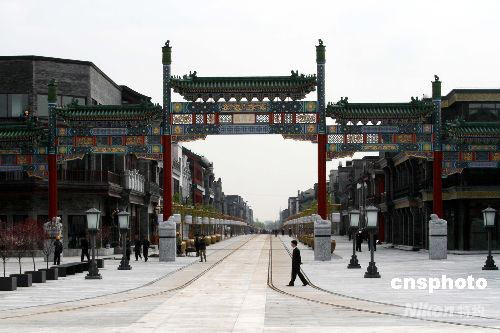 2008年4月21日,北京前門大街改造工程基本修整完畢,其正陽門及兩旁的建筑已展露出較強的明清時代的風韻。今年“五一”,前門步行街將對游人開放。中新社發 任丘 攝