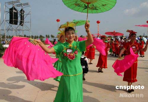 三亞民眾載歌載舞期待奧運圣火的到來。 中新社發 周兆軍 攝