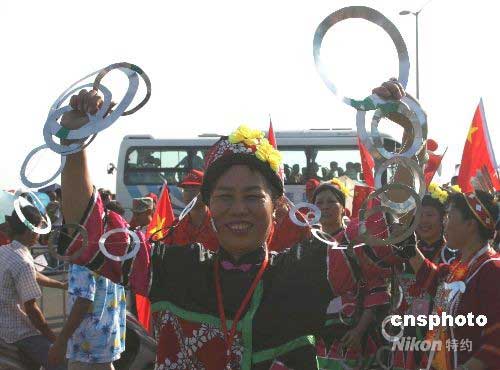 5月6日上午8時10分許,北京奧運圣火在海南省海口市傳遞,這是圣火在海南傳遞的最后一站,數(shù)十萬民眾走上街頭祝賀奧運圣火在海口傳遞。圖為少數(shù)民族笑逐顏開迎接奧運圣火。中新社發(fā) 尹海明 攝