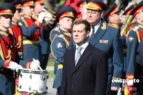 俄羅斯新任總統梅德韋杰夫來到克里姆林宮西北側紅墻下的亞歷山大花園,向無名烈士墓敬獻花圈,紀念衛國戰爭勝利63周年。這是梅德韋杰夫就任總統后的首場正式活動。中新社發 田冰 攝