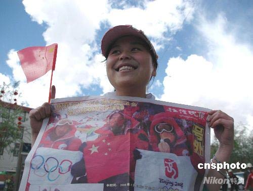 5月8日上午9時許,奧運圣火成功登上珠峰后,拉薩街頭一片歡騰,市民歡天喜地奔走相告。拉薩的平面主流媒體《拉薩晚報》,全面刊登了奧運圣火登珠峰的詳細消息,一些熱心市民自發(fā)走上街頭,發(fā)送報紙,引得市民爭相觀看。 中新社發(fā) 周波 攝