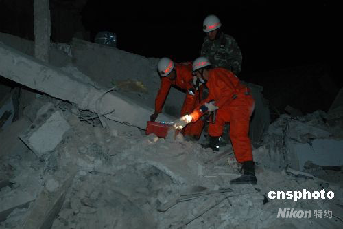 12日下午2:30左右,受四川汶川地震波及,重慶市梁平縣文化鎮(zhèn)一小學(xué)教學(xué)樓發(fā)生垮塌。13日凌晨1時許,記者從梁平縣政府辦公室獲悉,目前搜救工作已全部結(jié)束,垮塌造成5人死亡,36人受傷。圖為消防人員正利用生命探測器對廢墟下的傷員進行探測。 中新社發(fā) 郭虹 攝