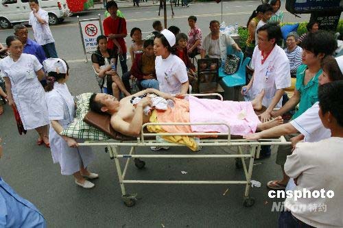 5月12日,四川省遂寧市船山區(qū)人民醫(yī)院將病人疏散到安全地帶繼續(xù)治療。當(dāng)日14時(shí)28分,四川汶川發(fā)生7.8級(jí)地震,波及幾百公里之外的遂寧市,時(shí)間持續(xù)2分多鐘,造成當(dāng)?shù)夭糠址课莸顾。截止發(fā)稿之時(shí),人員傷亡情況正在統(tǒng)計(jì)之中。目前當(dāng)?shù)卣呀?jīng)啟動(dòng)緊急預(yù)案,城市將人員疏散到安全地帶,群眾情緒穩(wěn)定,社會(huì)持續(xù)井然。中新社發(fā) 鐘 敏 攝