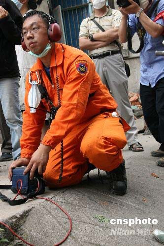 圖為救援隊在現場使用聲音探測器,探測廢墟下是否有聲音。中新社發 齊彬 攝