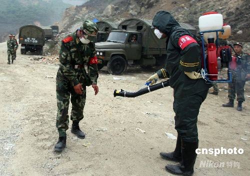 5月18日,一名專業防疫人員在四川省都江堰紫坪鋪水庫臨時碼頭對所有來自地震核心重災區映秀鎮的人員實施全面消毒,防止疫情發生。中新社發 任晨鳴 攝