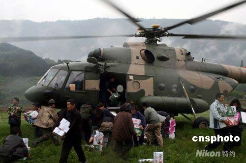 5月14日10時(shí)45分,成都軍區(qū)某陸航團(tuán)四架直升機(jī)抵達(dá)四川大地震震中汶川縣。這是災(zāi)后第一次成功降落到汶川災(zāi)區(qū)的飛機(jī),為受災(zāi)群眾送去了生活必需品。中新社發(fā) 張雷 黃龍 攝