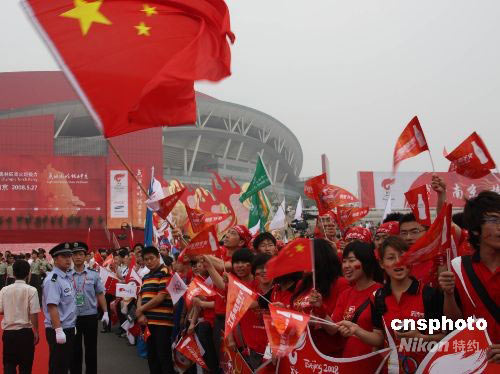 圖為起跑儀式開(kāi)始前,南京的群眾夾道高呼“奧運(yùn)加油”。