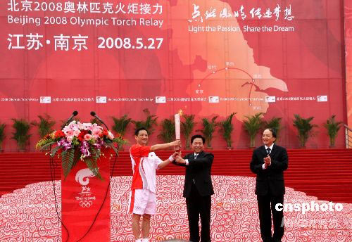 5月27日,奧運會火炬傳遞活動來到江蘇省省會、六朝古都南京。擔任南京站傳遞活動第一棒火炬手是羽毛球名將楊陽,早上8點他從江蘇省委書記梁保華手中接過“祥云”火炬,拉開了南京站傳遞序幕。 中新社發 崔佳明 攝