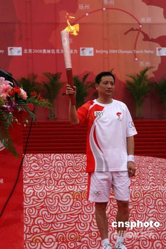 圖:南京首棒火炬手楊陽現場展示火炬