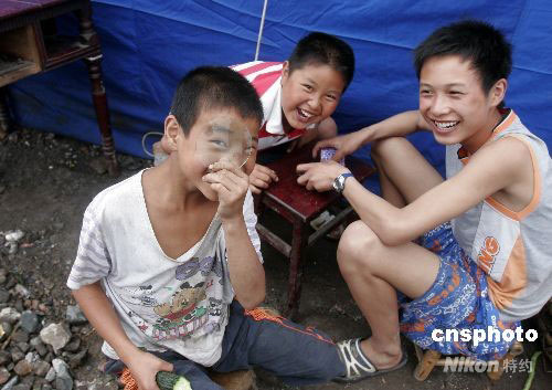 5月29日,四川什邡市鎣華鎮雪門寺村的小朋友漸露童真笑臉。災難已經過去,生活依然繼續。雖然內心深處還深埋苦痛的記憶,廢墟中劫后余生的孩子們漸漸恢復笑臉,讓人們感受到明日生活的陽光和希望。中新社發 張曉理 攝