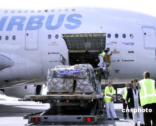 巴黎時間5月30日下午,由中國駐法國大使館組織的第二批救災帳篷從巴黎戴高樂機場啟運四川地震災區,這批帳篷共1105頂,價值25萬多歐元。帳篷的募集得到了法國僑界、法國企業界的大力支持,由空客提供巨無霸A380飛機運送。另外,中國駐法使館和僑界組織的第三批救災帳篷1000頂將于30日夜里啟運四川。中新社發 吳衛中 攝