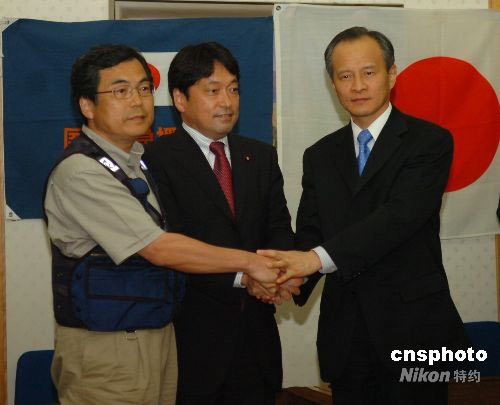 6月2日晚間,日本國際緊急援救隊結(jié)束為期兩周的在中國汶川地震災(zāi)區(qū)醫(yī)療援助活動返回東京,受到中國駐日大使崔天凱等中國駐日使館官員、在日華人華僑留學(xué)生的熱烈歡迎。圖為崔天凱與前來迎接醫(yī)療隊歸國的日本外務(wù)副大臣小野寺五典(中)、醫(yī)療隊團長田尻和宏(左)。中新社發(fā) 朱沿華 攝
