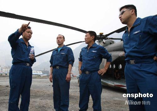 成都軍區(qū)陸航團(tuán)團(tuán)長(zhǎng)親率機(jī)組飛抵映秀鎮(zhèn),準(zhǔn)備運(yùn)送遇難戰(zhàn)友回營(yíng)。中新社發(fā) 賈國(guó)榮 攝