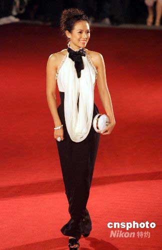 章子怡穿著上白下黑的長裙走上愛心大道,頭上別著水鉆的閃亮發飾,成為最亮麗明星。中新社發 潘索菲 攝