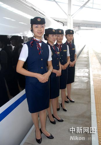 乘務員都是經過重重選拔,外形條件業務素質都比較高,她們甜美的微笑吸引了很多記者的鏡頭。王紅綱 攝