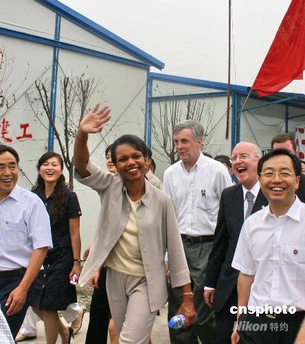 6月29日,美國國務(wù)卿賴斯在四川省副省長黃小祥的陪同下前往四川地震重災(zāi)區(qū)都江堰慰問當(dāng)?shù)孛癖姟D為賴斯與安置點(diǎn)的受災(zāi)民眾揮手告別。中新社發(fā) 黃永莉 攝