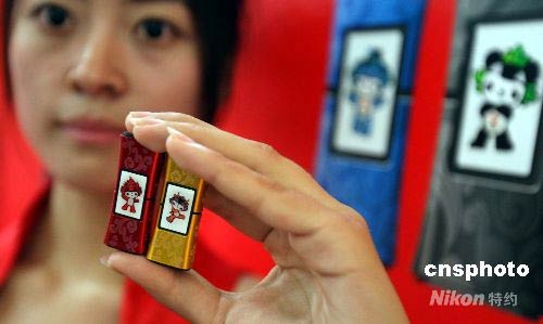 七月二日,北京2008年奧運特許商品奧運吉祥物電子紀念章、聯(lián)想火炬閃存盤等正式推向市場。特別是聯(lián)想奧運吉祥物閃存盤由于價格適中、實用性強,一上市就受到消費者的喜愛。 中新社發(fā) 任海霞 攝