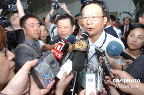 7月4日,臺灣彰化縣長卓伯源先生搭乘華信航空的周末包機從臺中甫抵廈門,即在機場接受蜂擁而至的記者集體采訪。中新社發 鄭祚聲 攝