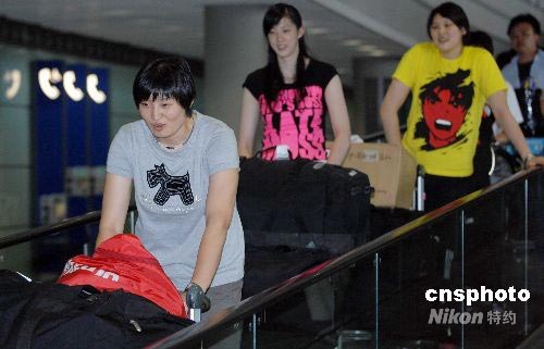 七月十四日中午,在剛剛結束的世界女排大獎賽中五戰四負,最終僅位列第五的中國女排從日本返回北京。中新社發 陳文 攝