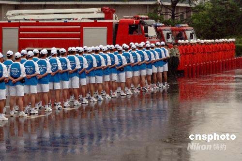 7月16日下午,奧運火炬在吉林延吉傳遞,消防隊員和火炬護跑手整齊列隊等待出發。 中新社發 廖攀 攝