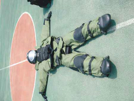 排爆服能夠防護(hù)爆炸后產(chǎn)生的超壓、碎片、沖擊波,對(duì)排爆專家進(jìn)行全方位的保護(hù)。其頭盔里,裝有智能型電池驅(qū)動(dòng)電源系統(tǒng)和排風(fēng)系統(tǒng),還有智能式聲音放大器及巨響防護(hù)裝置。排爆服“躺”在地上,就像一個(gè)人。它是目前世界上最先進(jìn)的防爆服,歷經(jīng)5年時(shí)間在全新平臺(tái)上研制出來(lái),具備最新的模塊化防護(hù)組合,提供更高的防護(hù)能力。它的配置更加齊全,腕部配有頭盔遙控器,調(diào)節(jié)和控制更加方便。頭盔面罩可以掀起,頭盔上方配備高亮度發(fā)光二極管照明燈,操作更加方便。一米范圍內(nèi),500克炸藥爆炸不會(huì)危及排爆者的生命。