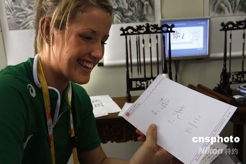 7月29日,來自愛爾蘭的女選手在北京奧運(yùn)村中文服務(wù)中心,請人幫助自己起了一個好聽的中文名字“梅美蘭”非常開心。 中新社發(fā) 杜洋 攝