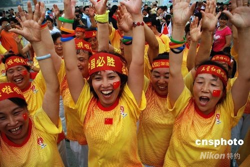 8月8日上午,北京市宣武區(qū)100多名群眾拉拉隊在天安門廣場東側(cè)的奧運(yùn)倒計時牌下為奧運(yùn)加油。當(dāng)晚8點(diǎn),奧運(yùn)會將在北京開幕,天安門將舉行隆重的慶祝活動。中新社發(fā) 楊慧峰 攝