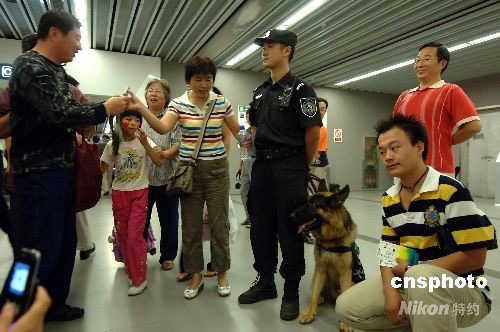 大批去奧林匹克公園的乘客即興與警員和公交警犬合影留念。 中新社發 鄒憲 攝