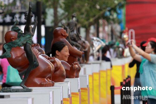 9月22日,奧林匹克藝術品亮相北京王府井大街,參觀游客絡繹不絕。 中新社發 鄭雄增 攝