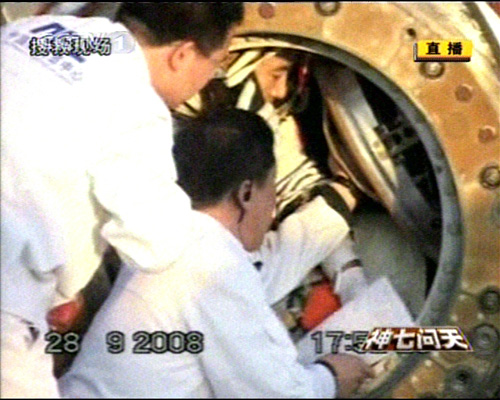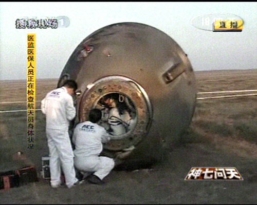 神舟七號飛船返回艙順利著陸,返回艙外觀檢查正常,搜救隊員按程序打開返回艙艙門,醫監醫保人員檢查航天員身體狀況。經醫監醫保人員檢查,三名航天員身體狀況良好。三人面帶笑容。