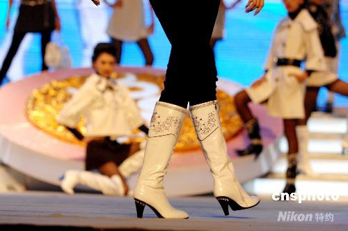 10月3日晚,在北京舉行的第二屆中國品牌節(jié)頒獎晚會上,模特在展示時尚鞋秀。所展示的中國品牌鞋融入了中國青花瓷元素,新穎別致而又時尚。中新社發(fā) 張愛東 攝