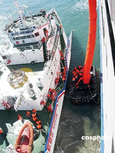 圖為客滾船釋放海上救生撤離系統,通過兩條高20多米直通海面的垂直救生滑道快速將受困旅客轉移到前來救援的船上。