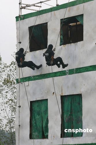 10月21日上午,遂寧市公安特警在進行反劫持人質演習。當天,四川遂寧市公安大練兵暨反恐演習舉行。中新社發 鐘 敏 攝