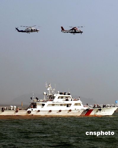 圖為直升機配合海上救助船只進行演練。中新社發 王東明 攝